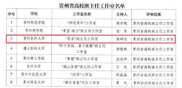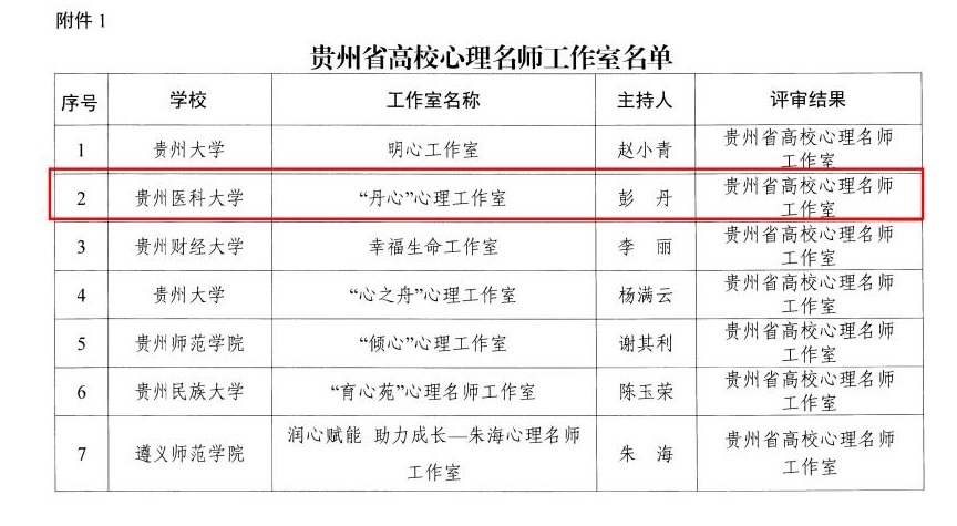 近日,贵州省教育厅发布《省教育厅关于公布贵州省高校心理名师工作室、班主任工作室评选结果的通知》,我校大学生心理健康教育与咨询中心副主任、医学人文学院副院长彭丹主持的“丹心”心理工作室成功获评“贵州省高校心理名师工作室”,基础医学院微生物学教研室主任陈峥宏主持的“思来”班主任工作室获评“贵州省高校班主任工作室”。