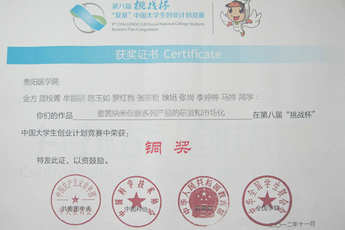 在第八届 “挑战杯”中国大学生创业计划竞赛上,由我校基础医学院康颖倩、曹煜老师指导的,2007、2008级生物技术专业及2009级临床医学专业本科生金方、张宗哲、徐旭等共同完成的参赛作品“姜黄纳米保健系列产品的研发和市场化”荣获铜奖。
