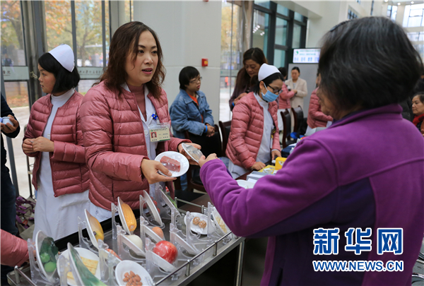 11月14日,华体网页版附属医院的医生在“联合国糖尿病日”义诊活动中为患者介绍糖尿病人饮食注意事项。