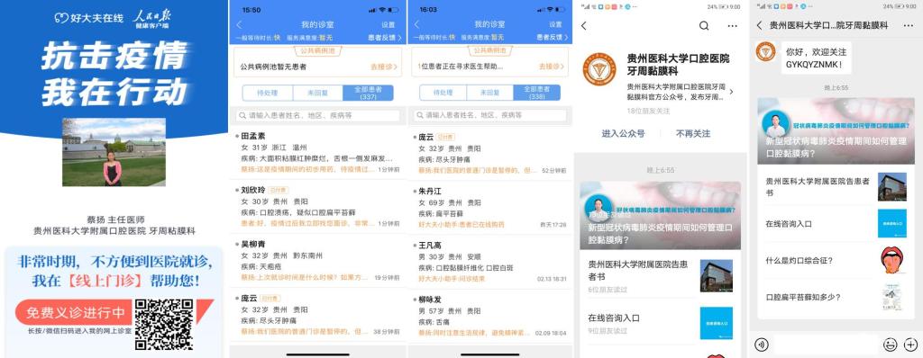 科主任统筹安排科室工作,为解决患者在疫情期间的口腔疾病就诊需求,更好地利用网络为患者服务,疫情期间,牙周黏膜科申请了微信公众号,利用网络平台在疫情期间做好病人的咨询工作和本科室的宣传工作。公众号申办后,针对疫情期间患者咨询较多的问题,科室医护还撰写一些科普文章,例如:疫情期间如何管理口腔黏膜病?什么是灼口综合征等,同时,科主任蔡扬积极开展线上义诊等活动,为有口腔咨询的患者提供服务,疫情期间已为30余位患者提供了口腔咨询服务。